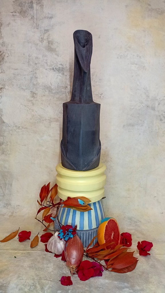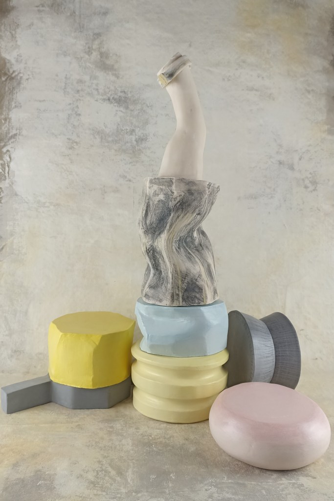 Dans mon travail, le socle est un élément fondamental de la sculpture, au delà de sa fonction principale de désigner l’oeuvre, il la transforme et oriente le regard. Les socles sont assemblés et forment un seul élément avec le sculpture. Ils en influencent la dynamique et offrent un point de vue différent sur la forme.